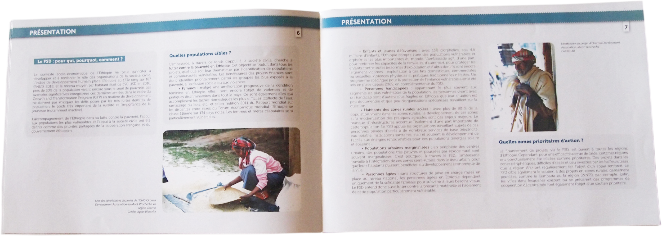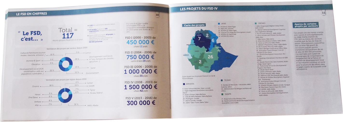 Réalisation de la mise en page d’un rapport présentant les missions du FSD en Éthiopie. Le document a été décliné en deux versions, en français et en anglais, afin de répondre aux besoins de communication bilingue.
