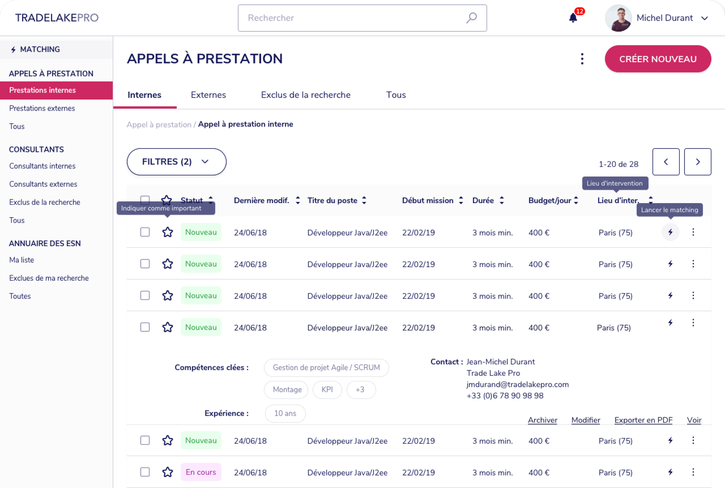 Tradelake Pro était un moteur de matching, pensé pour mettre en relation des PME et des entrepreneurs de la tech autour d’annonces de missions. L’objectif était de simplifier et fluidifier le recrutement de profils indépendants. En collaboration avec une UX designer, nous avons conçu l’expérience utilisateur de cette nouvelle plateforme afin d’apporter une solution innovante sur le marché du recrutement.