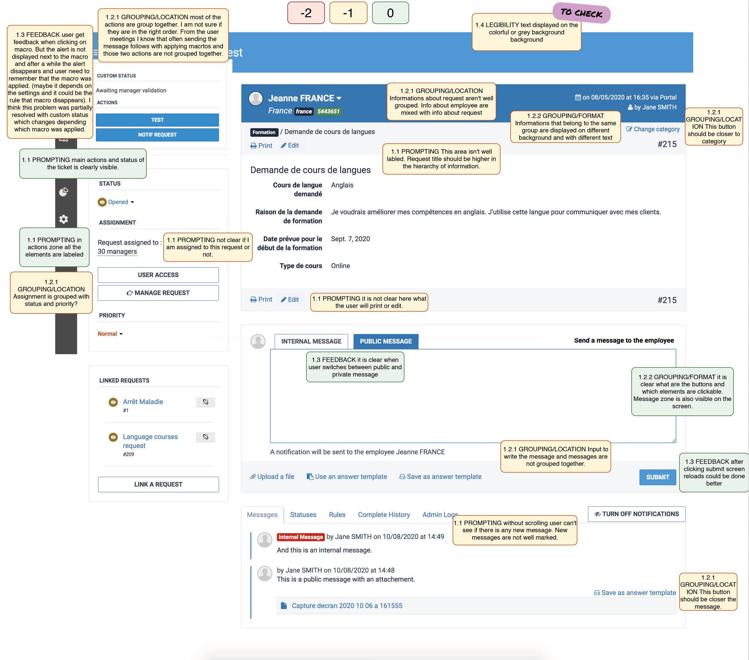 Au démarage du projet j’ai réalisé, avec l’aide de deux collègues, un audit ergonomique croisé en utilisant les critères heuristiques de Bastien et Scapin. Cela m’a permis de faire une première analyse approfondie des différents problèmes ergonomiques et d’en tirer rapidement de premières recommandations d’amélioration.